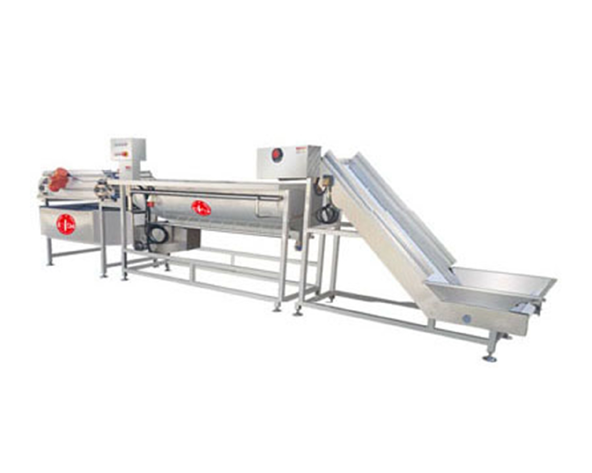 有提升機和旋流式洗菜機和震動輸送機這三部分組成。缸底布置高壓注氣管,高壓氣泡能夠有效分離成團的蔬菜,旋流管更加裝調(diào)壓閥以控制旋流,以適應清洗不同大小/重量物料時調(diào)整強度。360度循環(huán)翻轉(zhuǎn)按摩式清洗+10支高壓可調(diào)氣泡震動清洗,雙重潔凈清洗無論是整菜還是切好的段菜,碎菜,均能輕松應付.缸體內(nèi)部真正光滑半圓式設計,蔬菜在缸體內(nèi)部旋流清洗進程中只有持續(xù)的氣泡震動作用于蔬菜表面,沒有缸內(nèi)突出的水流噴口,避免物料清洗中的多次碰撞損傷,真正做到對蔬菜、果蔬洗凈過程中的加倍保護,避免受到細微損傷。采用振動式輸送替代傳統(tǒng)輸送帶式輸送,結(jié)構(gòu)更簡單,比傳統(tǒng)輸送帶減少清洗時間使用更方便。采用進口減震臂,保證在持續(xù)穩(wěn)定的低頻震動輸送過程中,有效瀝除多余水分,并為下一道脫水工序提供預脫水功能。